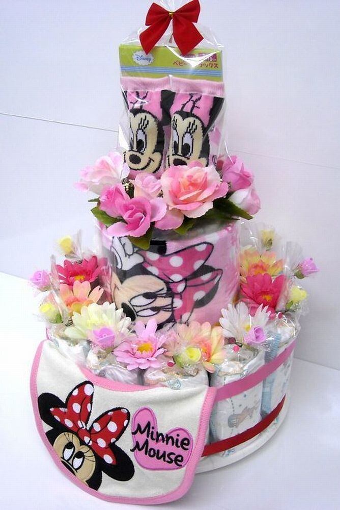 豪華な2段おむつケーキ、個別包装されたオムツをつかって、ラウンドケーキ風にアレンジされた、話題のオムツケーキです。女の子用に喜ばれる、ディズニー、ミニー柄のフェイスタオルとベビービブ付き。2段目のおむつロールケーキの上にミニー柄のベビーソックスが乗った人気の「おむつケーキ」ですよ。