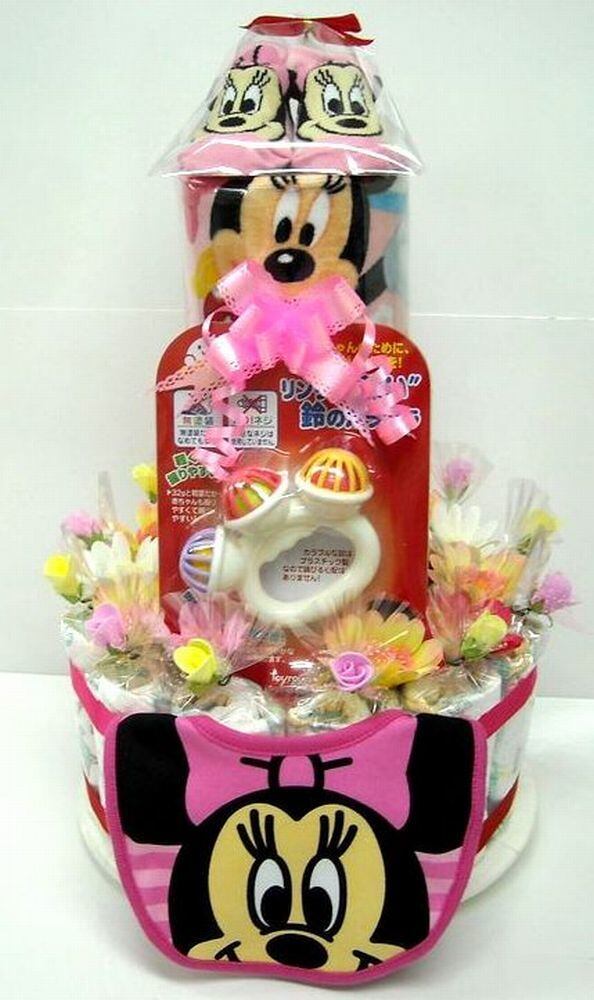 豪華な3段おむつケーキ、個別包装されたオムツをつかって、ラウンドケーキ風にアレンジされた、話題のオムツケーキです。女の子用ミニーちゃん、ディズニー、ミニー柄のフェイスタオルとハンドタオル、ベビービブ付き。おもちゃも付いています。ミニー柄のベビーソックスが乗った人気の「おむつケーキ」ですよ。