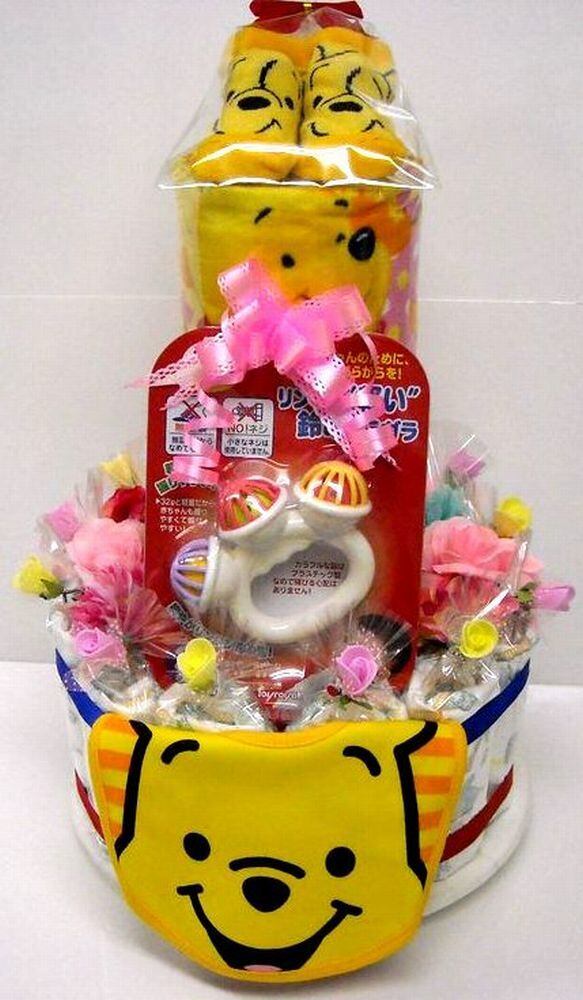 豪華な3段おむつケーキ、個別包装されたオムツをつかって、ラウンドケーキ風にアレンジされた、話題のオムツケーキです。男女共用、くまのプーさん。ディズニー、くまのプーさん柄のフェイスタオルとハンドタオル、ベビービブ付き。おもちゃも付いています。くまのプーさん柄のベビーソックスが乗った人気の「おむつケーキ」ですよ。