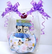 おむつをロール包みにしてキャラメル包装を施して、ロールケーキ風にアレンジされた、話題のオムツケーキです。ディズニー、ミッキー柄のベビーソックス、ベビービブ付き。可愛いカゴの中に可愛くセットされた人気の「おむつロールケーキ」ですよ。