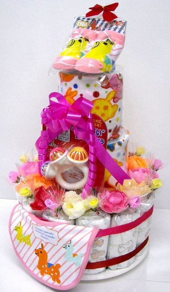 豪華な3段おむつケーキ、個別包装されたオムツをつかって、ラウンドケーキ風にアレンジされた、話題のオムツケーキです。ロディ柄のフェイスタオルとベビービブ付き。おもちゃも付いています。ロディ柄のベビーソックスが乗った人気の「おむつケーキ」ですよ。