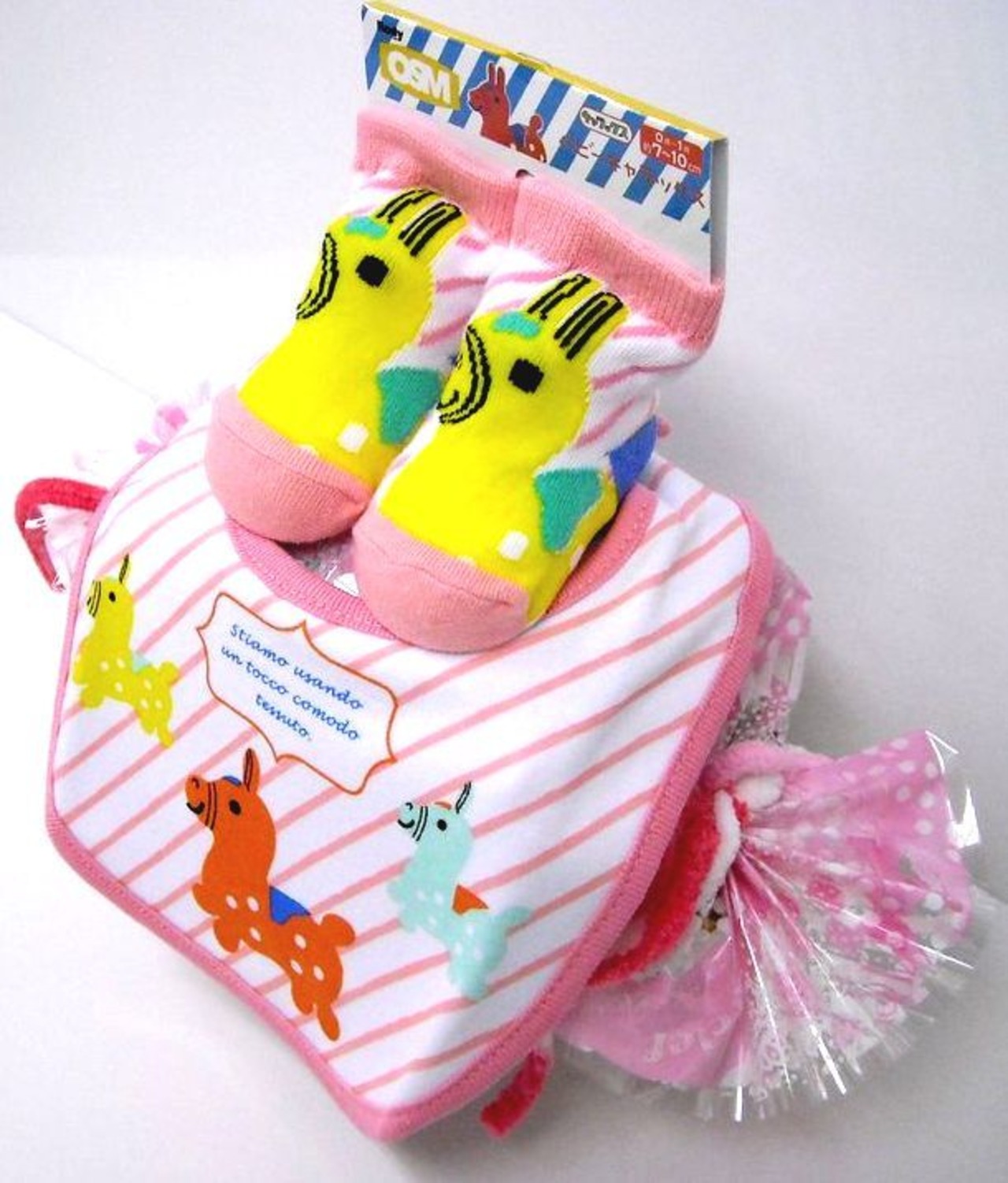 おむつをロール包みにしてキャラメル包装を施して、ロールケーキ風にアレンジされた、話題のオムツケーキです。赤ちゃんに大人気、可愛いお馬さんロディ柄のベビーソックス、ベビービブ付き。可愛いカゴの中に可愛くセットされた人気の「おむつロールケーキ」ですよ。