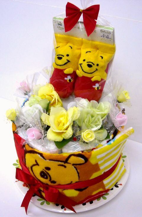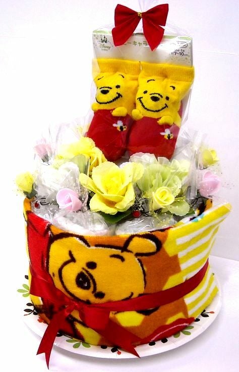 個別包装されたオムツをつかって、ラウンドケーキ風にアレンジされた、話題のオムツケーキです。 ディズニー、くまのプーさん柄のベビーソックスとフェイスタオルが付いています。人気の「おむつケーキ」ですよ。